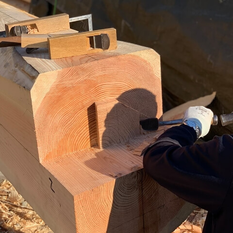 伝統技術を受け継いだ大工が用途によって木材を選別し、捩ねぢれや曲がり・歪みを調整しながら一本一本の材料に墨を付け、ノコギリや鑿のみを使って全て手作業で加工を行う工程が「手刻み」です。 -