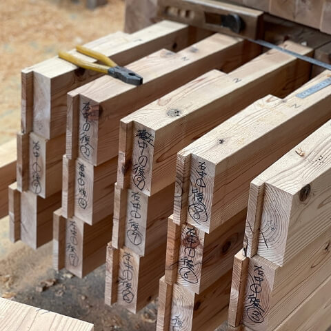 大工は自社で保管している木材や製材所から届いた木材を並べ、どこの場所にどの向きで使うのか決めていきます。